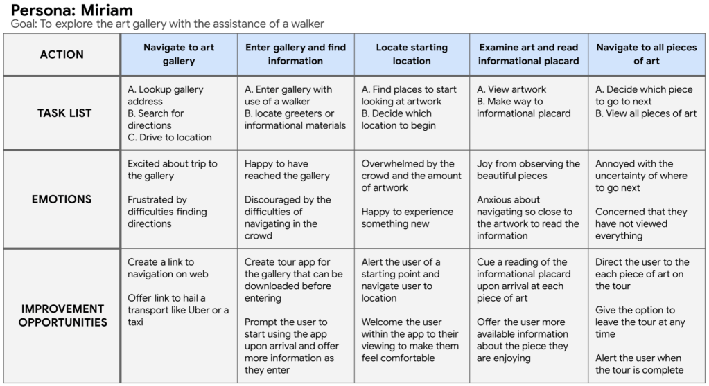 Problem Statement: Miriam is a retiree that uses the assistance of a walker to get around who needs to direct their way through a crowded art studio and explore each piece of art because they enjoy experiencing new things, but have difficulties navigating with limited mobility.