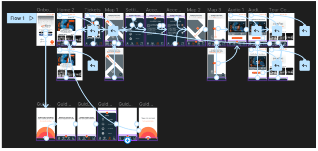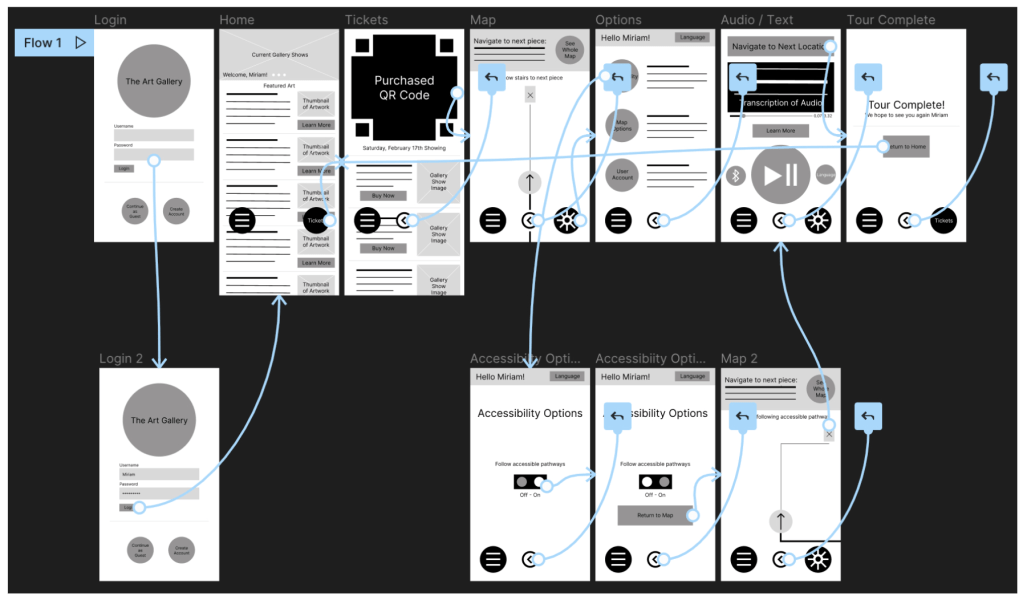The low-fidelity prototype connected the primary user flow of using the app to complete the gallery tour, so the prototype could be used in a usability study.