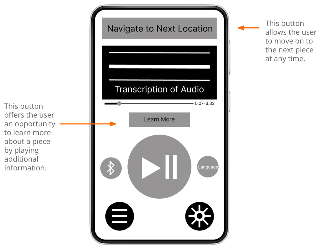 Design an app that makes assistive technologies available to users and guides them through an art gallery. Providing an equitable experience that is explorative and gives users a way to learn about art.
