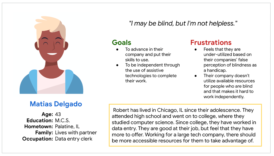 Problem Statement: Matias is an educated data entry specialist who is blind who needs to find a job with access to assistive technologies because they want to be an independent and valuable part of the workplace.