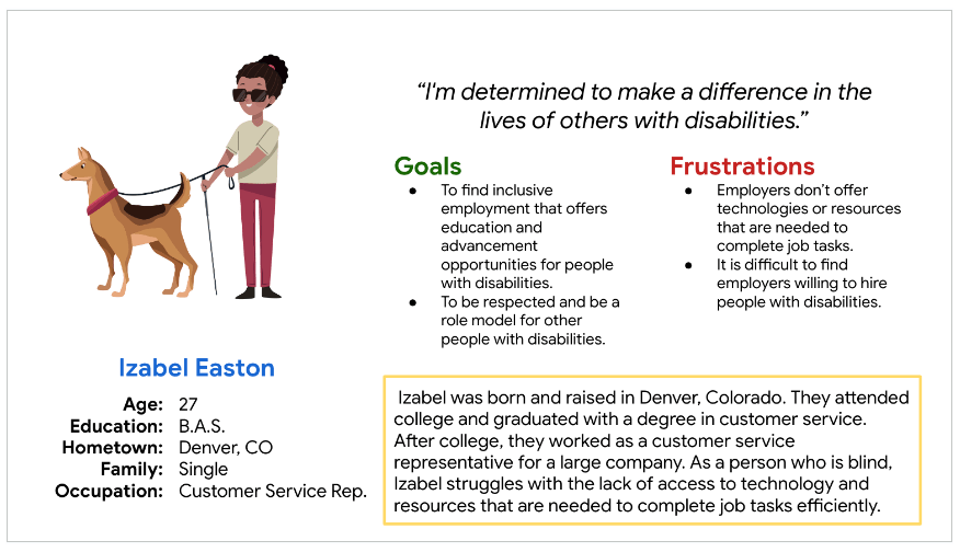 Problem Statement: Izabel is a customer service professional who is blind who needs a way to search for jobs that are inclusive and offer assistive resources because they want to find a job where they are respected and can inspire other people with disabilities.
