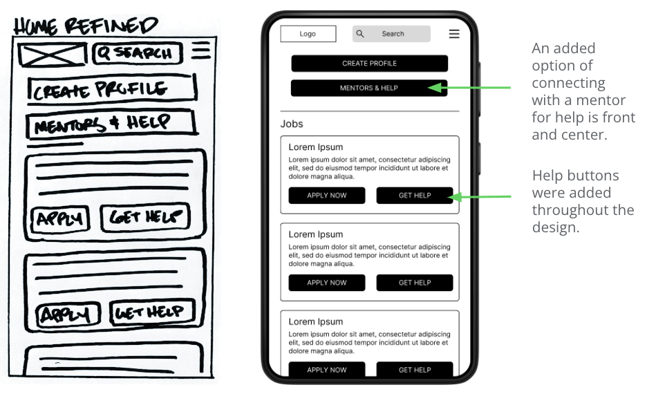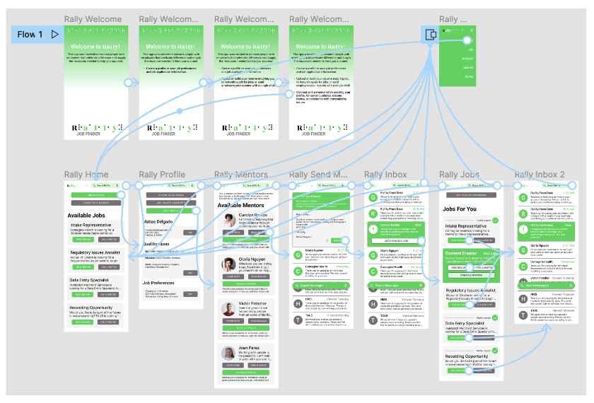The low-fidelity prototype connected the primary user flow of creating a profile, connecting with a mentor, and applying for a job, so the prototype could be used in a usability study.